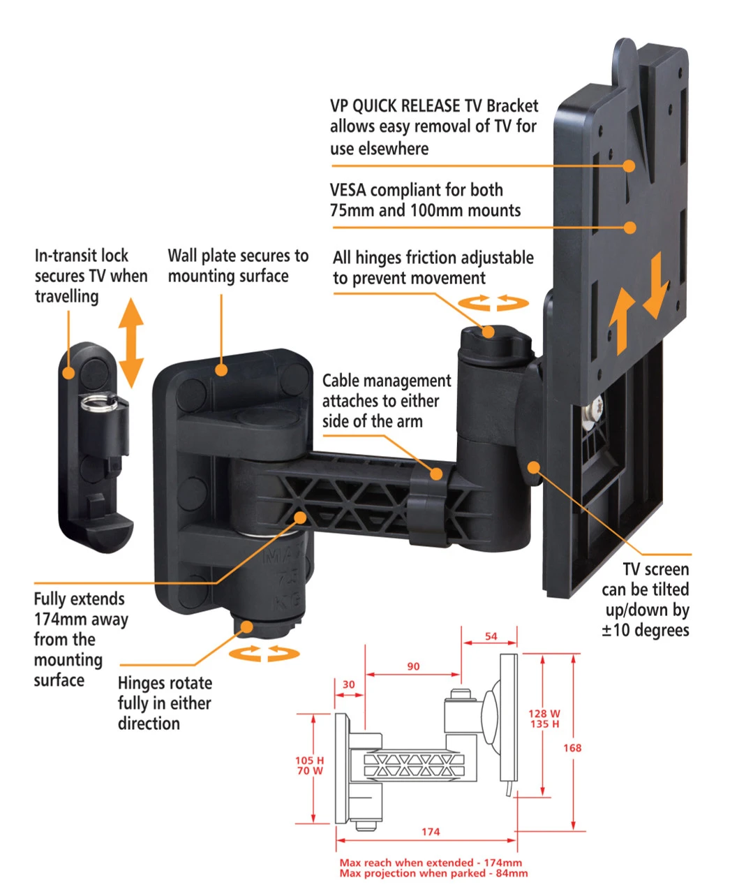 - SINGLE: Extends up to 174mm away from the wall, and only 84mm when folded away. Lightweight 0.7kg design
